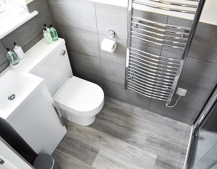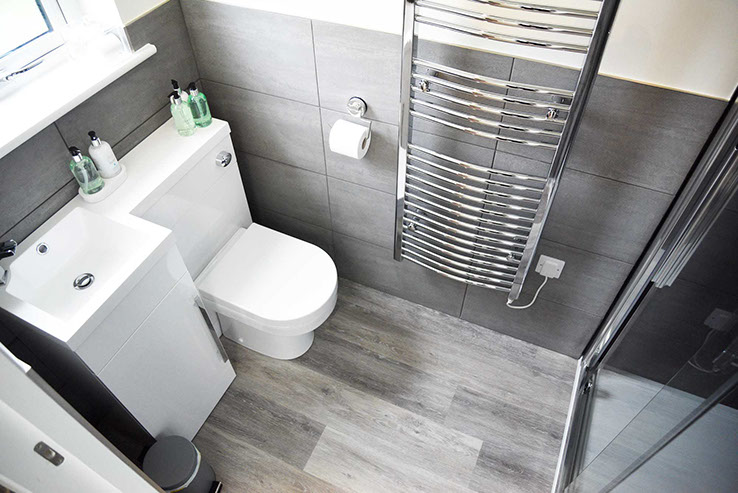 The bathroom is furnished to a very high standard and includes a shower and towel rail.